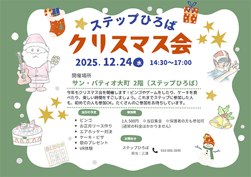 ステップひろばでは今年もクリスマス会を行ないます。これまでステップに参加した人も、初めての人も、保護者の方も参加OKです。ケーキやピザを食べて1年の疲れをいやし、楽しい時間をすごしましょう。